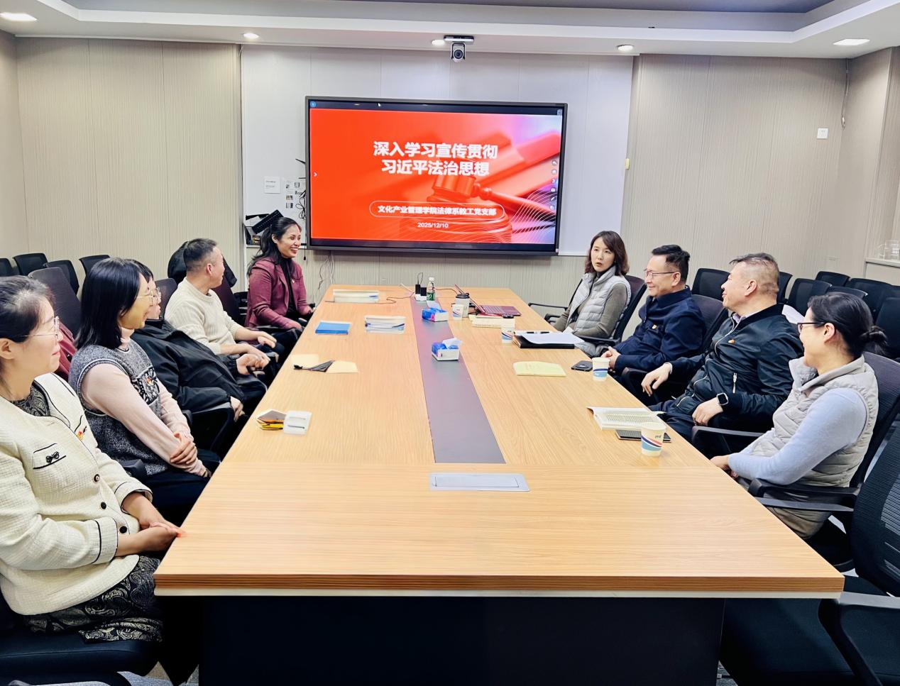 (通訊員 程科 攝影 葉懷陽 胥迪)12月10日下午,中國傳媒大學文化產業管理學院法律系教工黨支部舉行集體學習會,圍繞“深入學習宣傳貫徹習近平法治思想”主題,結合中央全面依法治國工作會議精神與新近出版的《習近平法治思想學習綱要(2025版)》展開深入研討。黨委常委、副校長李新軍出席會議并參與交流。文化產業管理學院院長張洪生列席會議,法律系主任鄭寧教授主持會議。